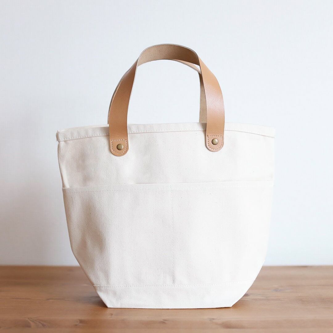 持ち手をレザーにすることでカジュアル過ぎない印象に。