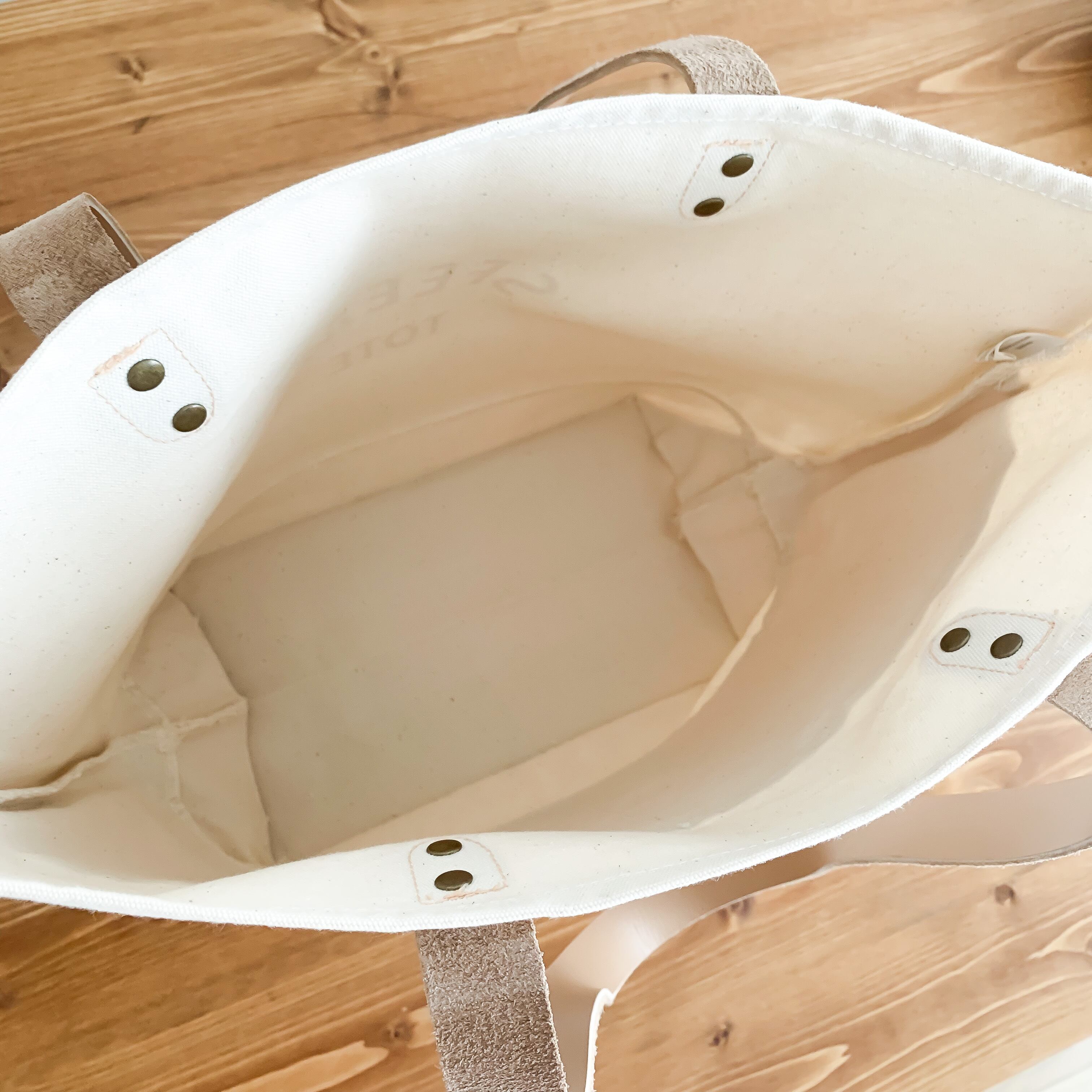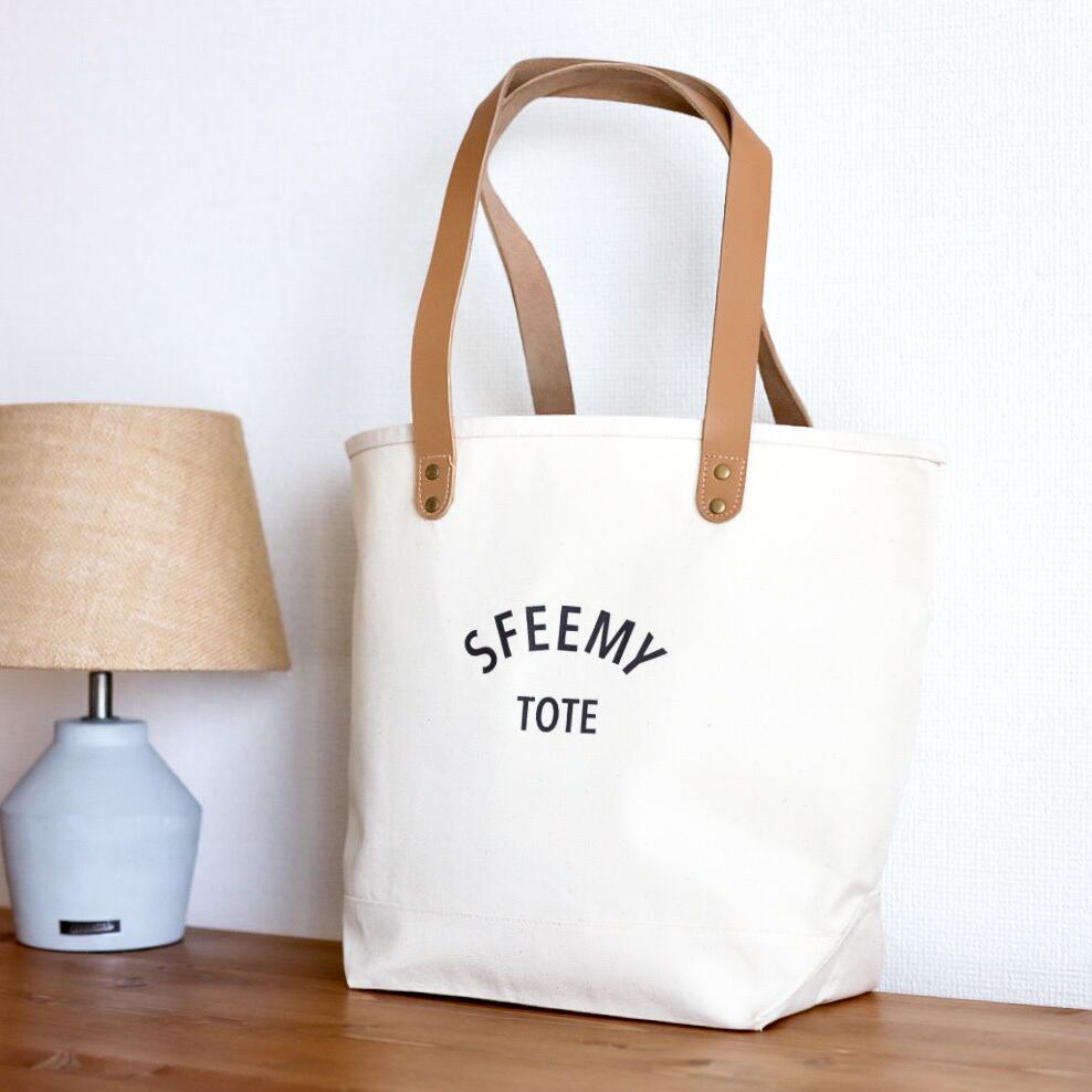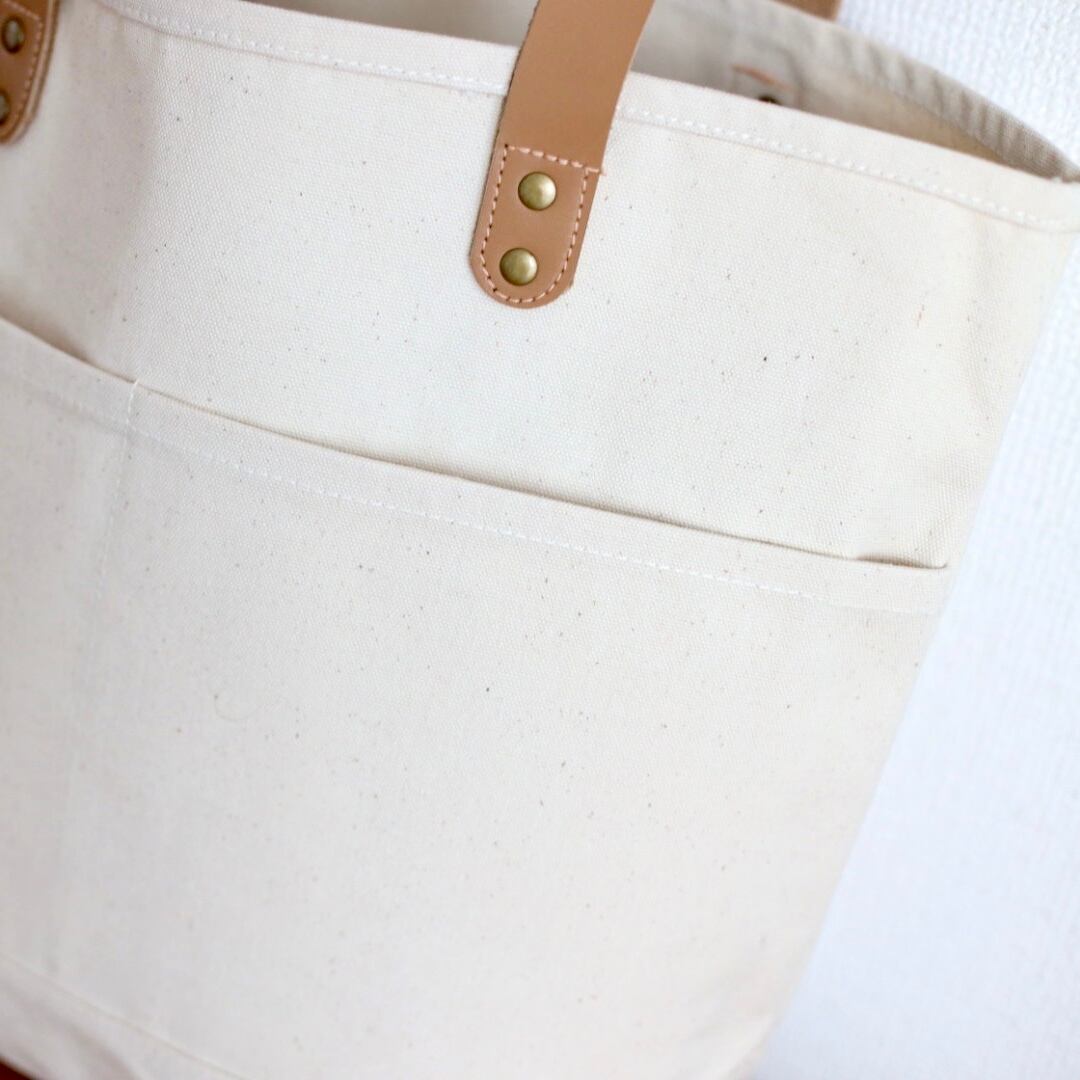 様々なスタイリングに合わせやすいベーシックなロゴトート。持ち手をレザーにすることでカジュアル過ぎない印象に。持ち手は肩掛け可能な長さ。