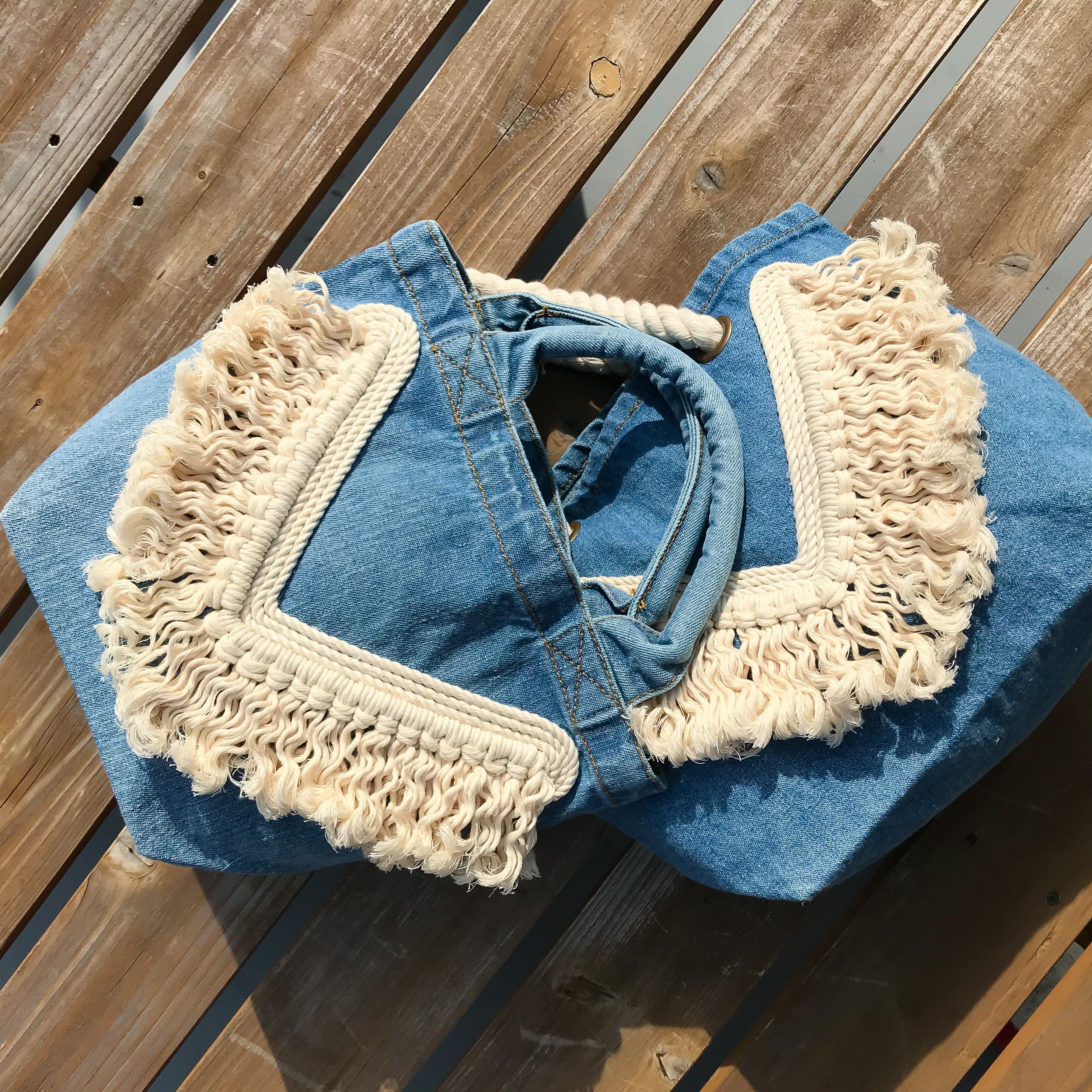 デニムにはウォッシュ加工を施しヴィンテージ感を出しました。ライトブルーのデニムにフリンジが映える爽やかなデザインのフリンジバッグです。カジュアルになりすぎるデニムバッグの持ち手をパイプハンドルにすることでカジュアル過ぎないスマートな印象に。