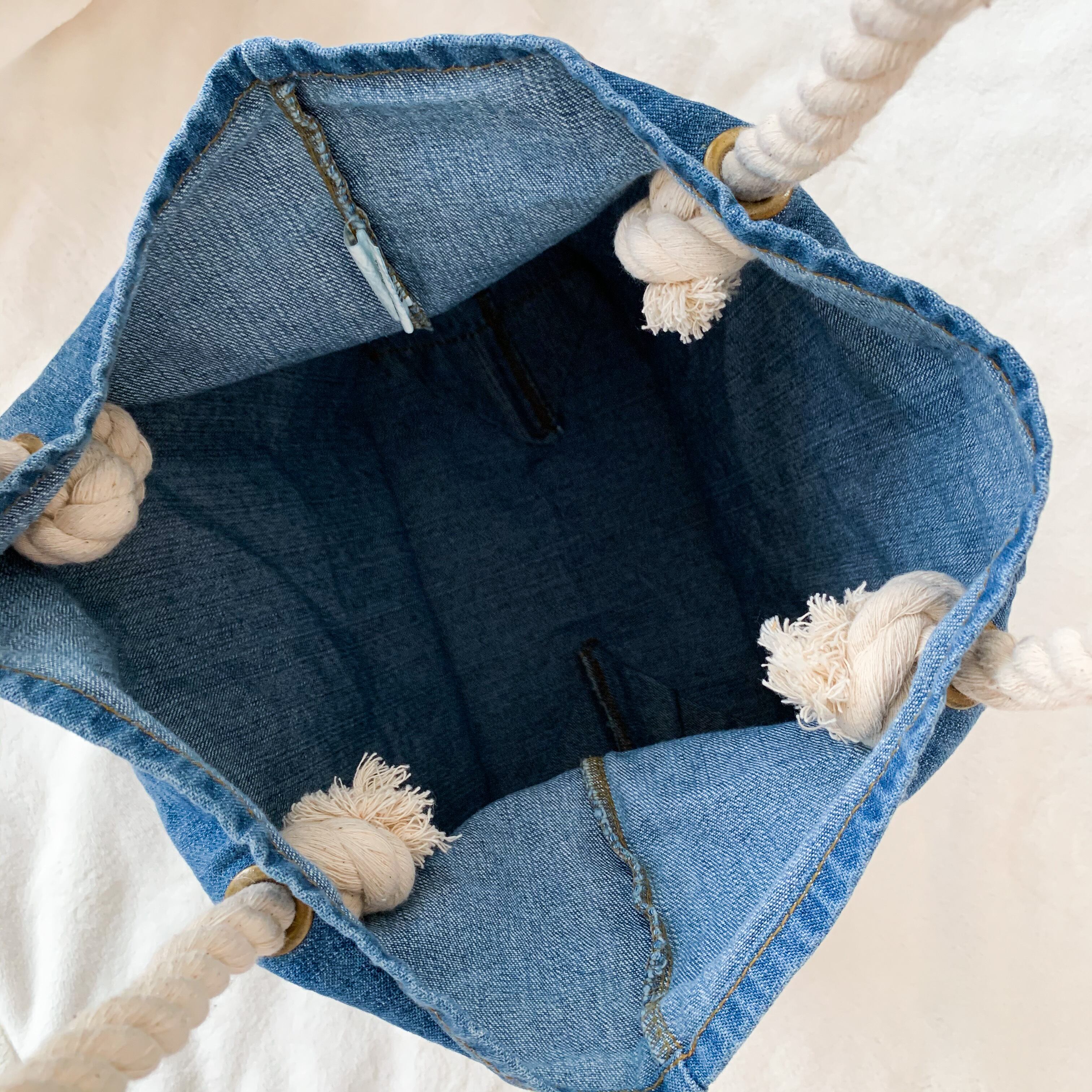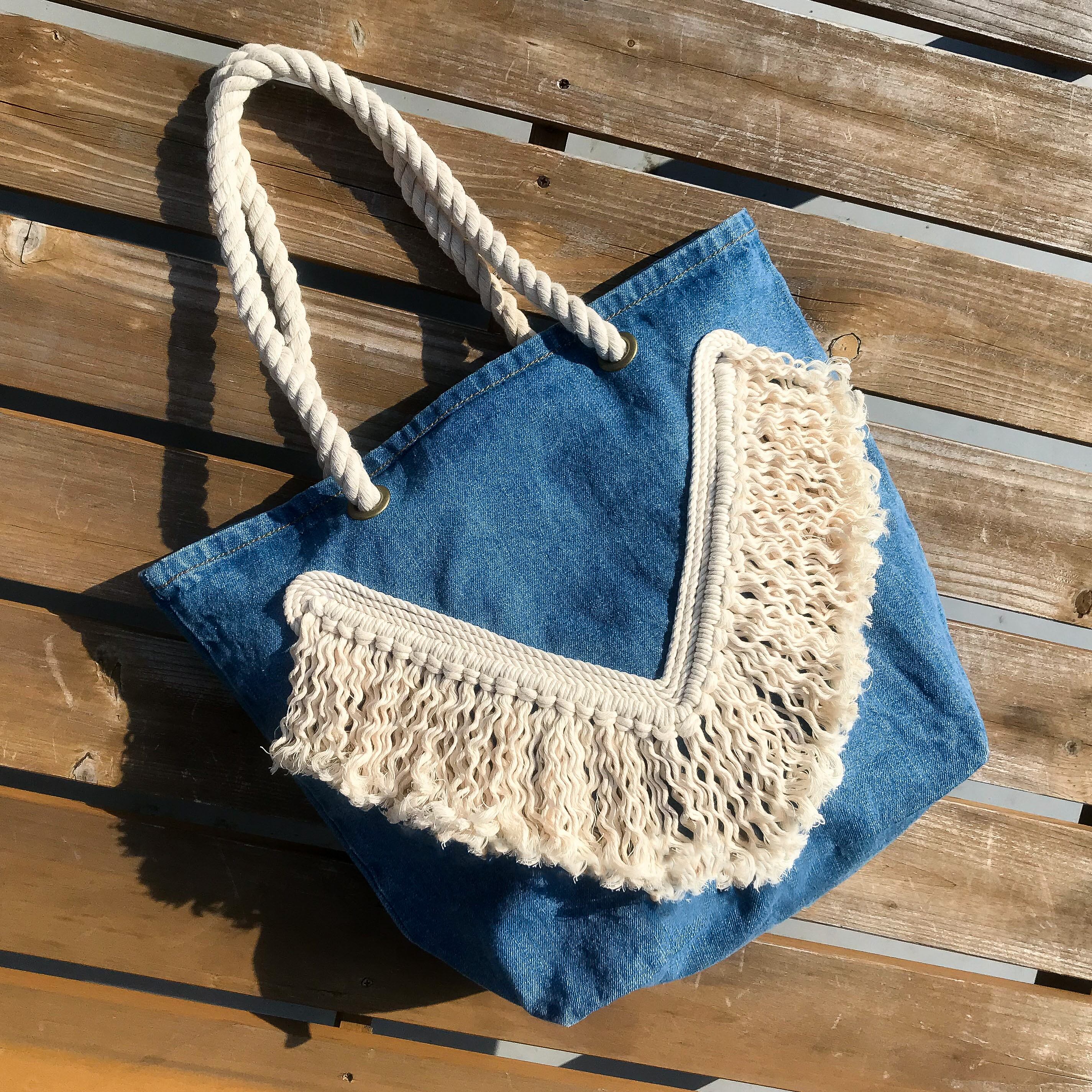 持ち手がロープハンドルのフリンジデニムバッグ。