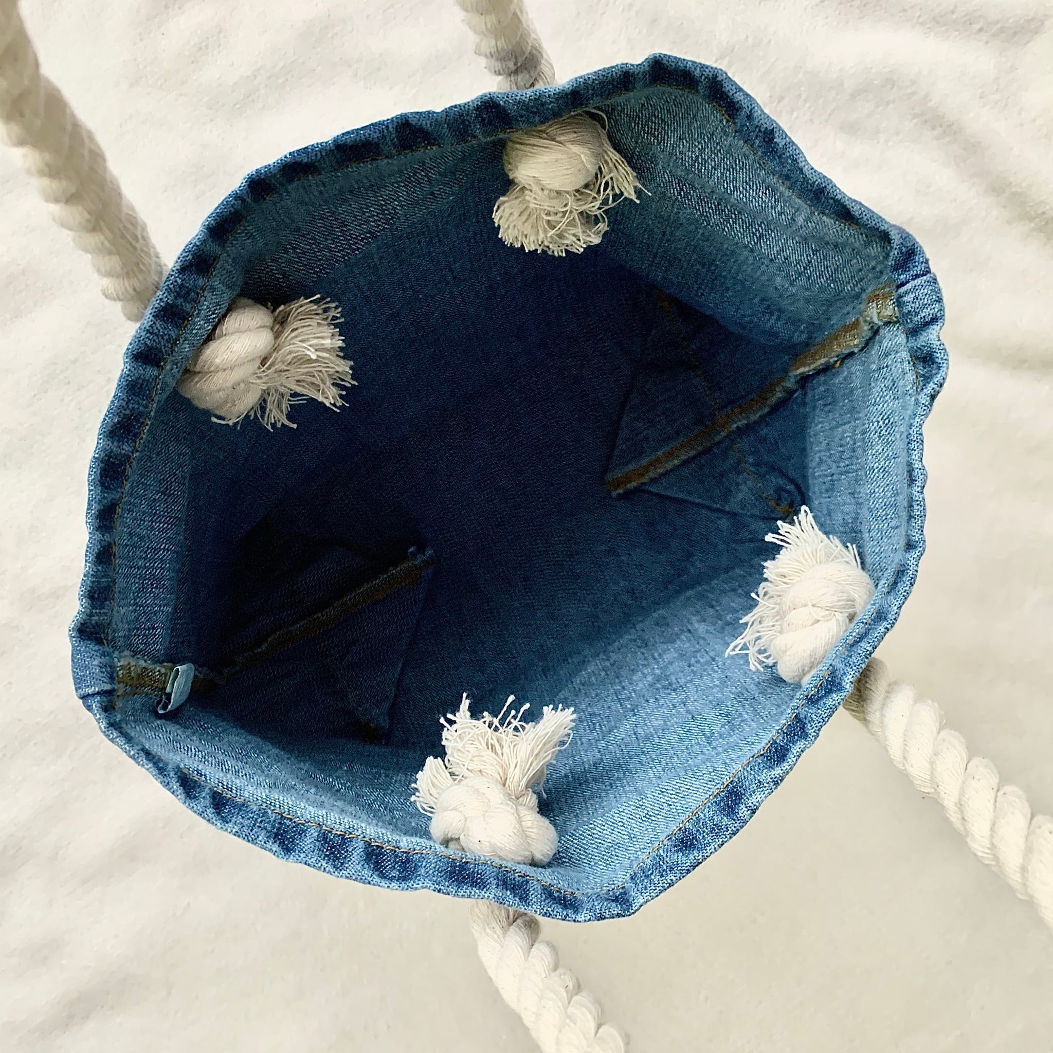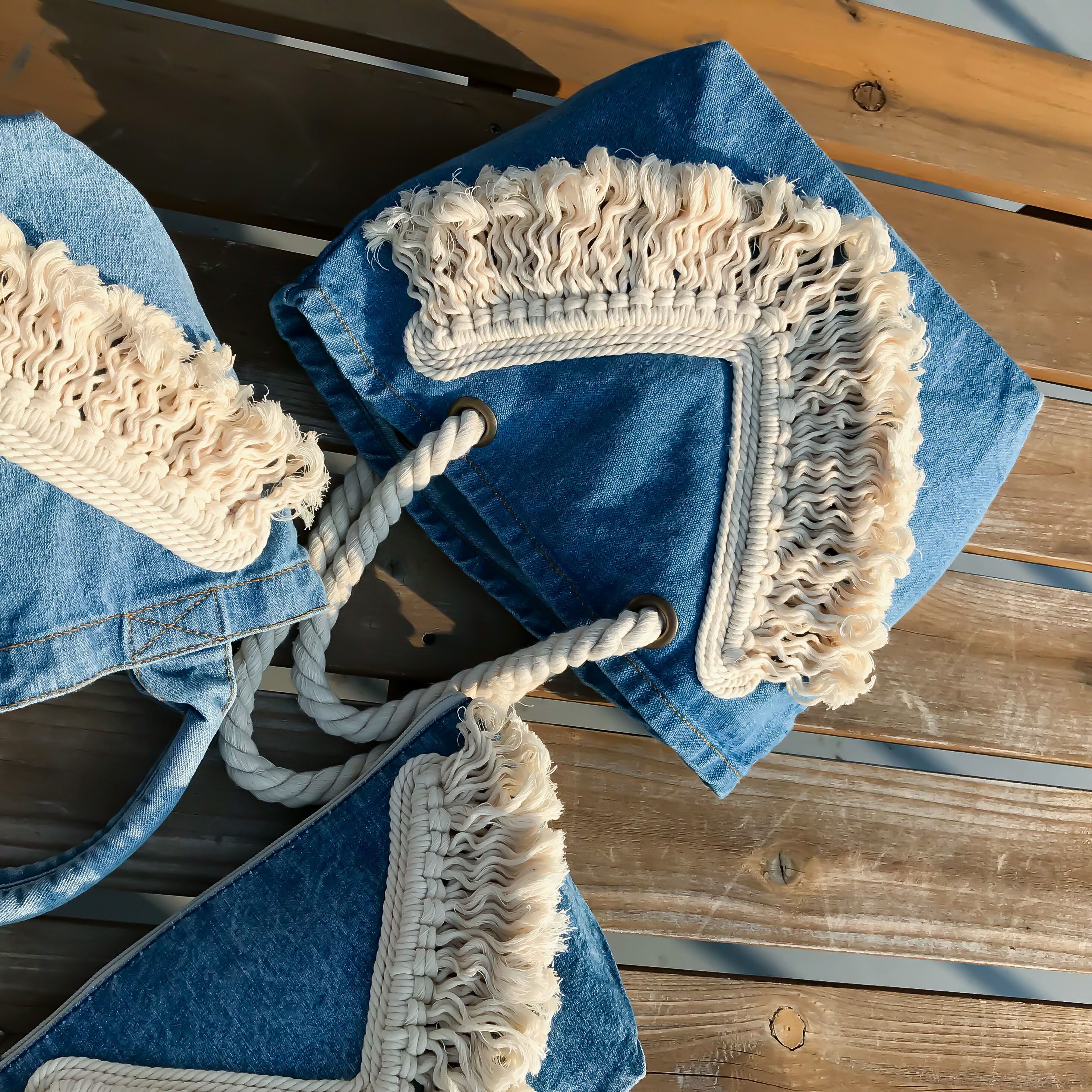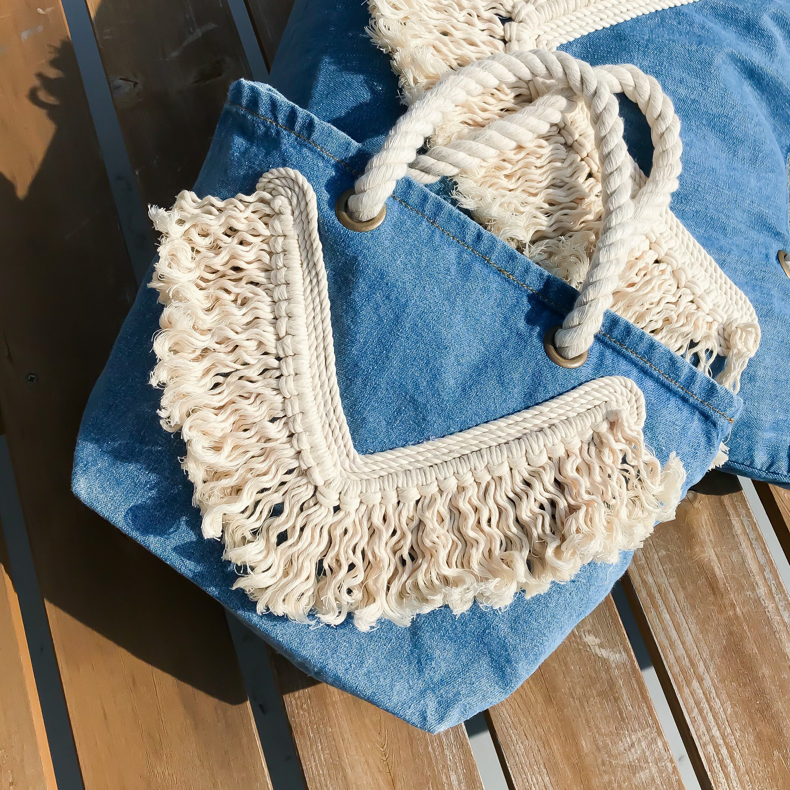 持ち手がロープハンドルのフリンジデニムバッグ。