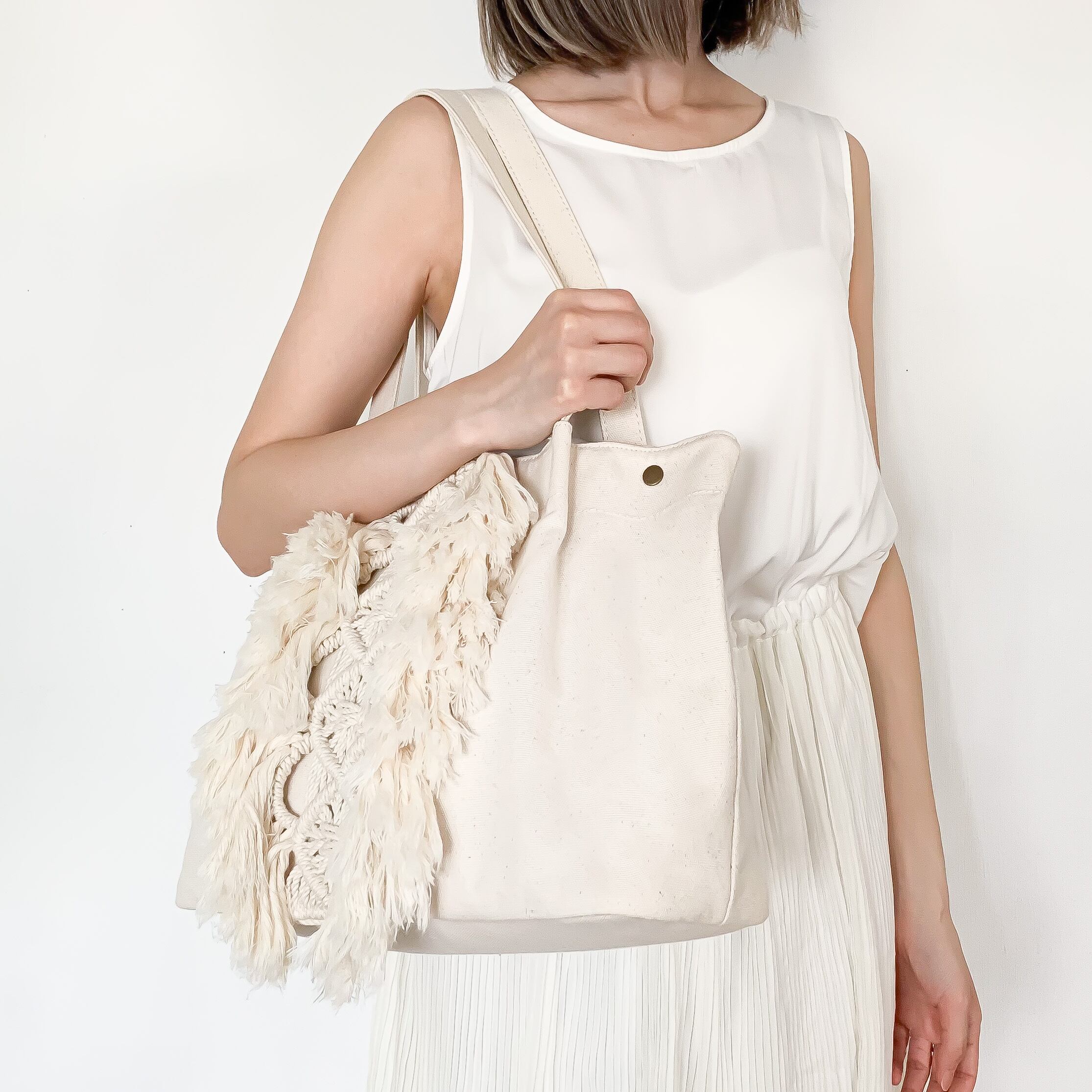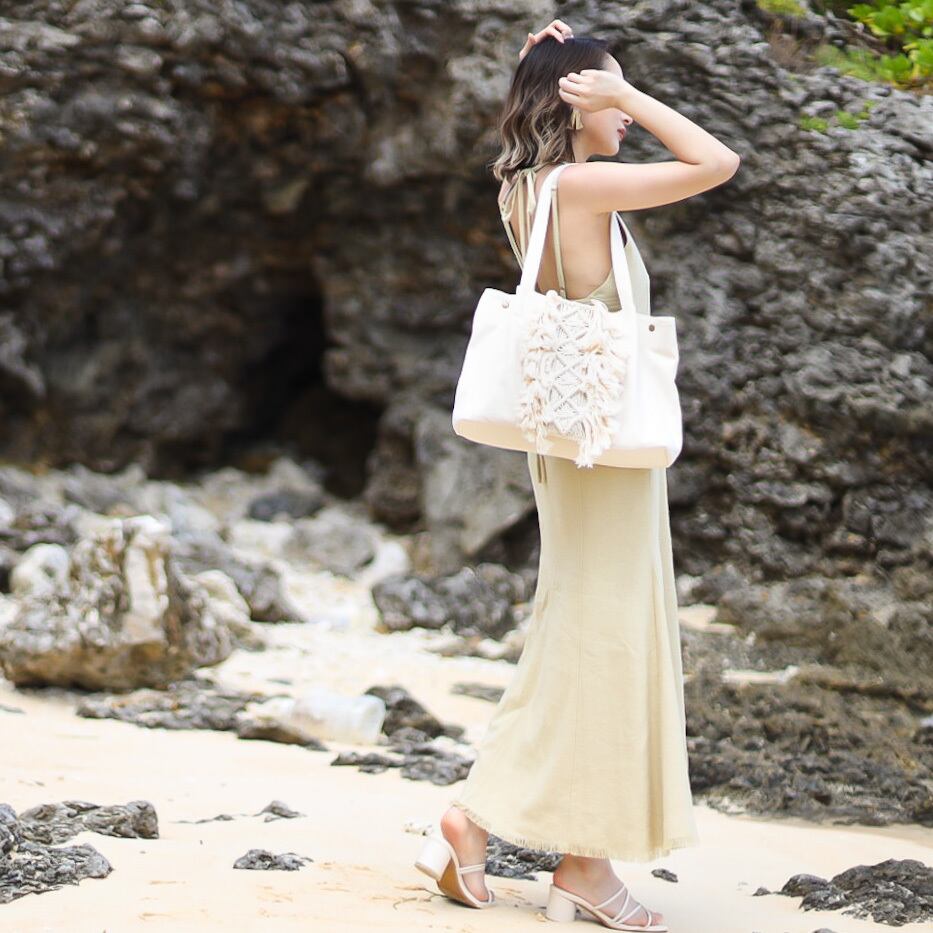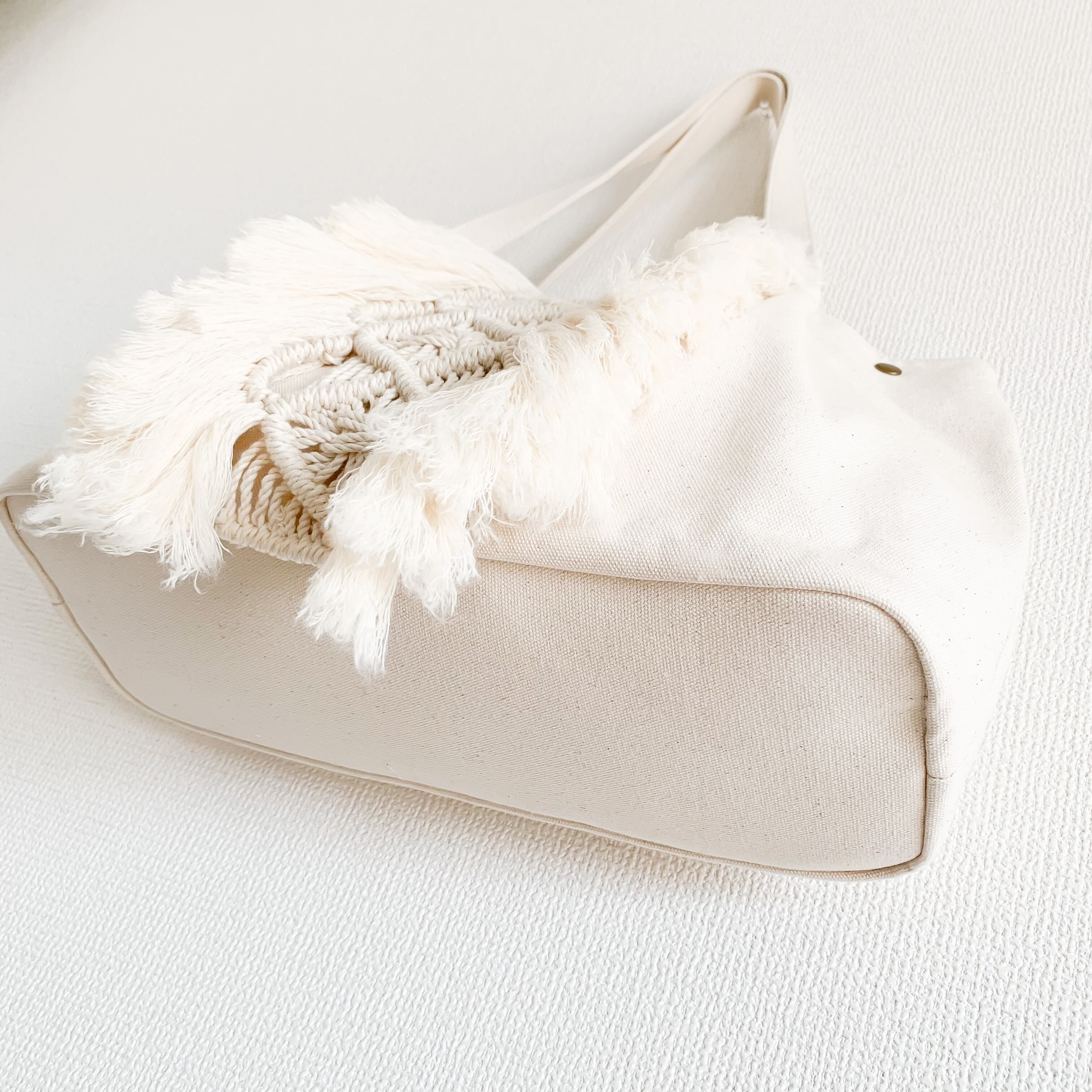 ふわふわのフリンジがかわいいデザインのマクラメトートバッグ。