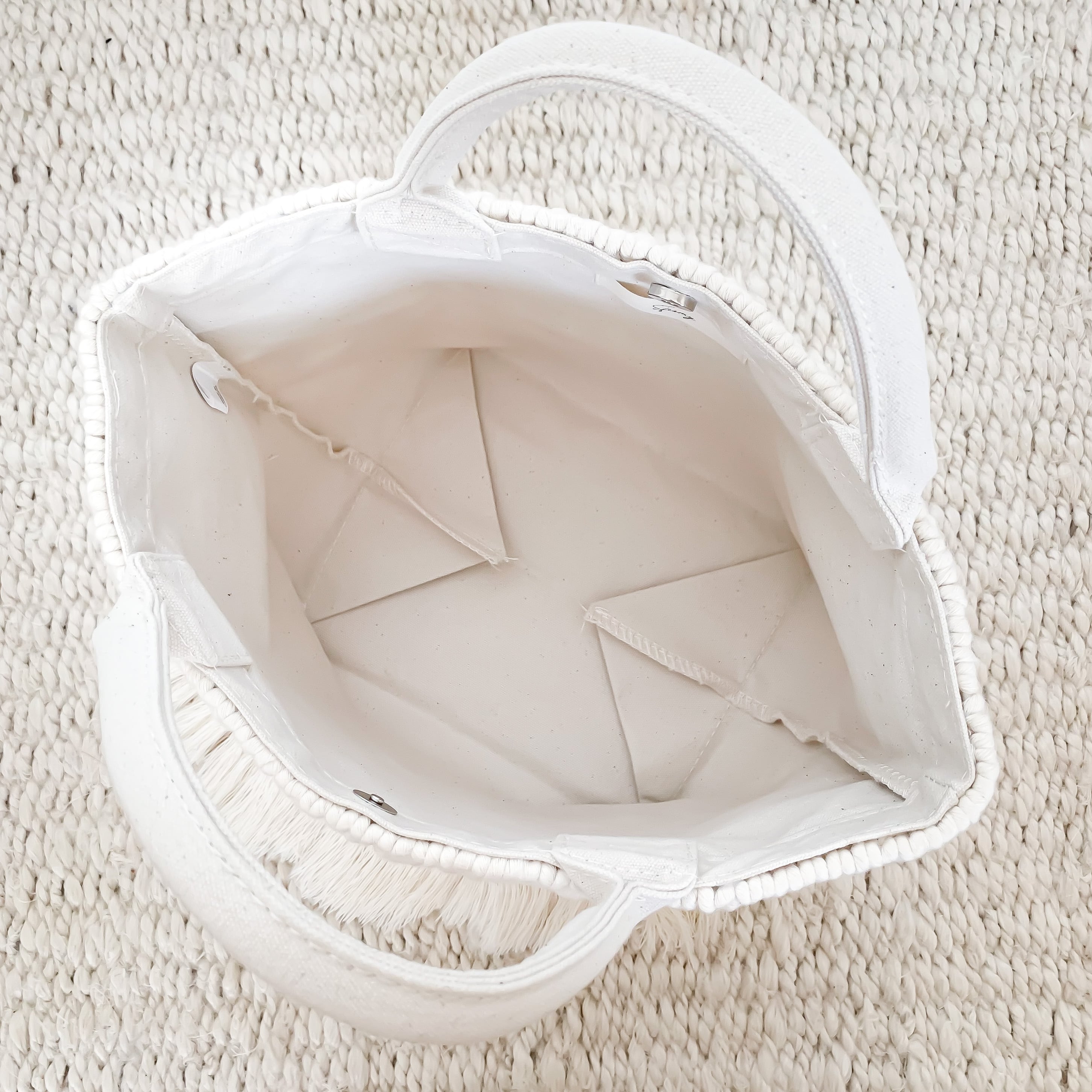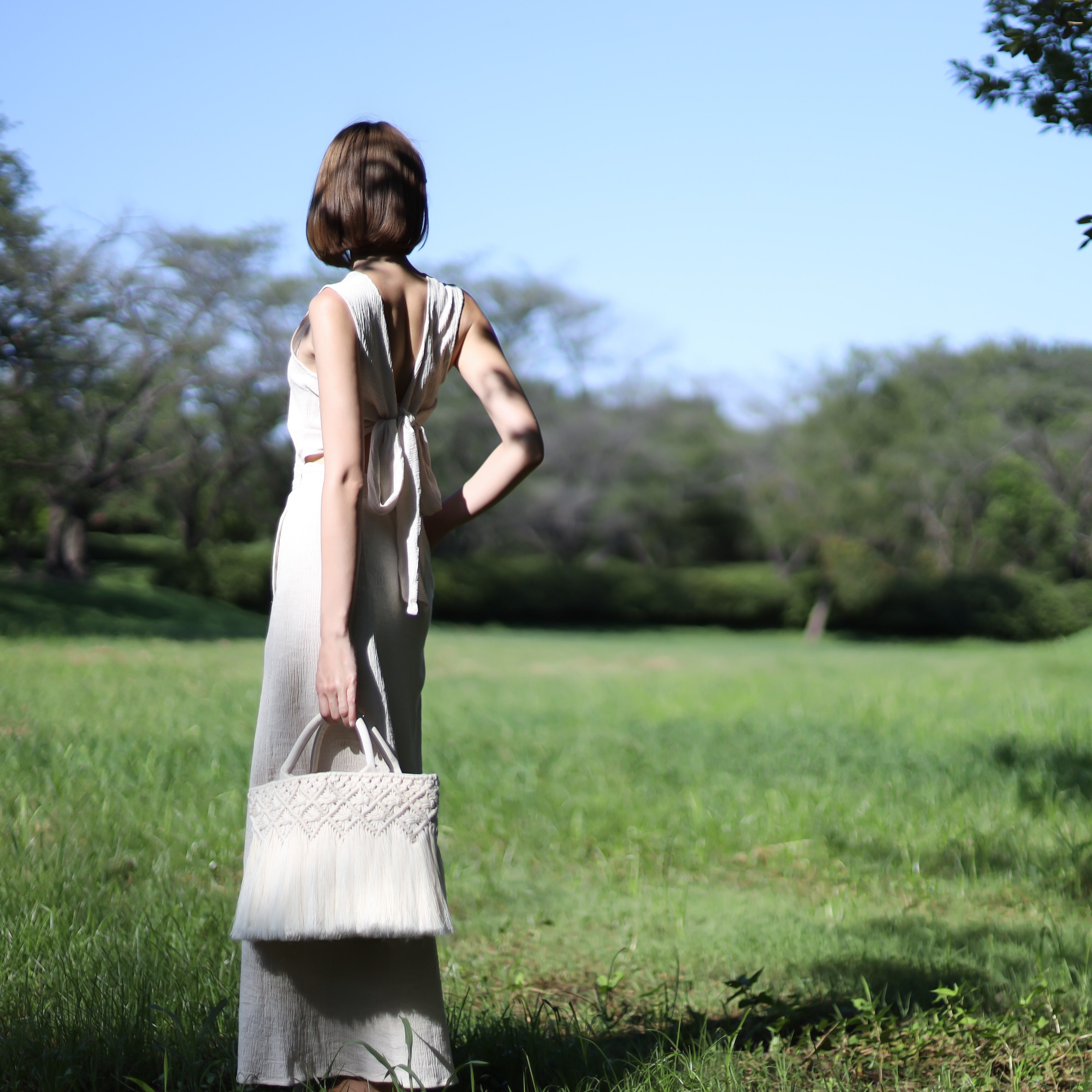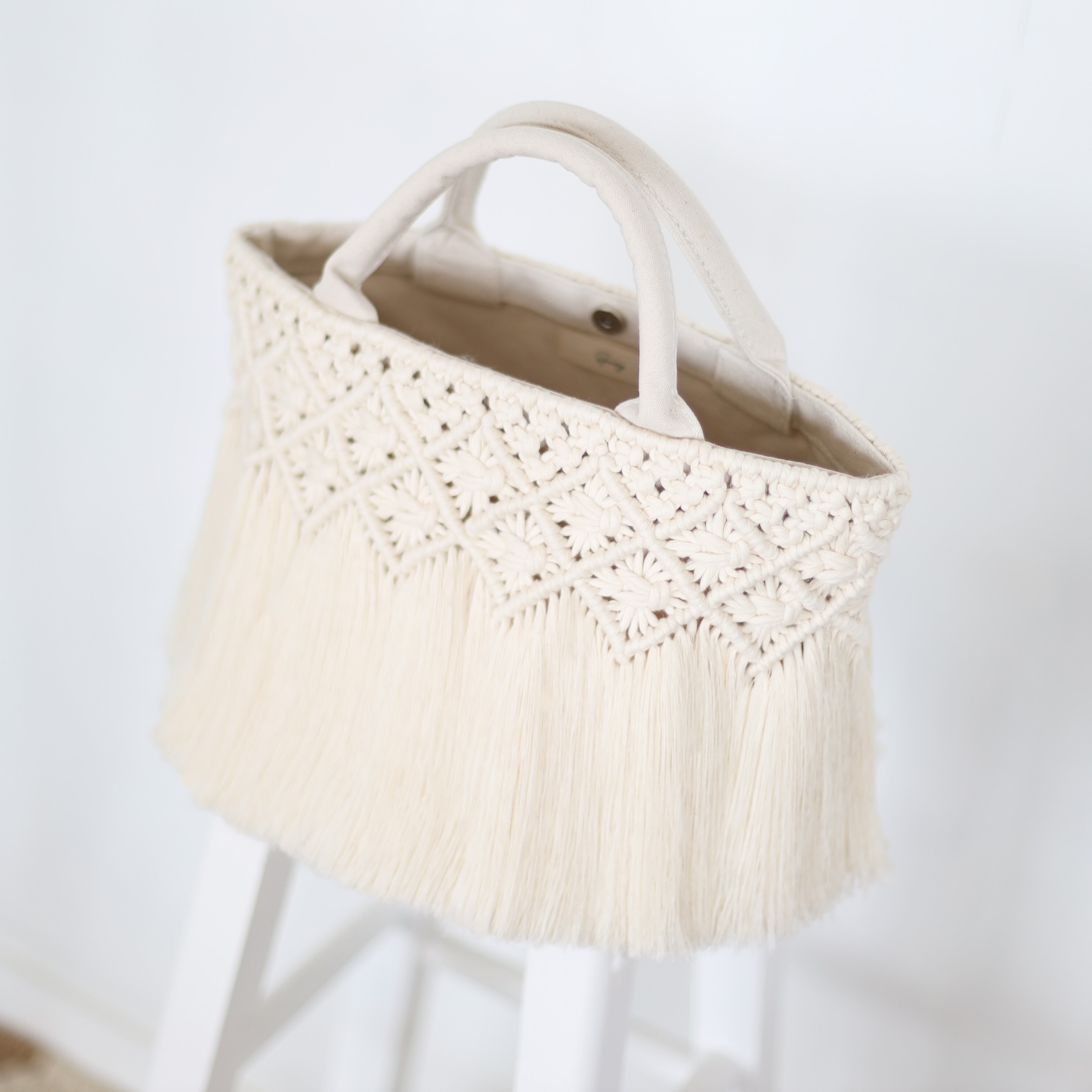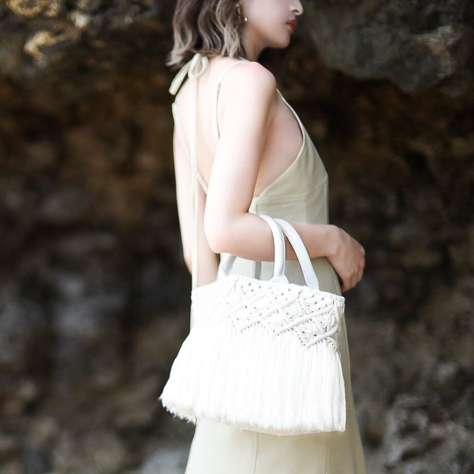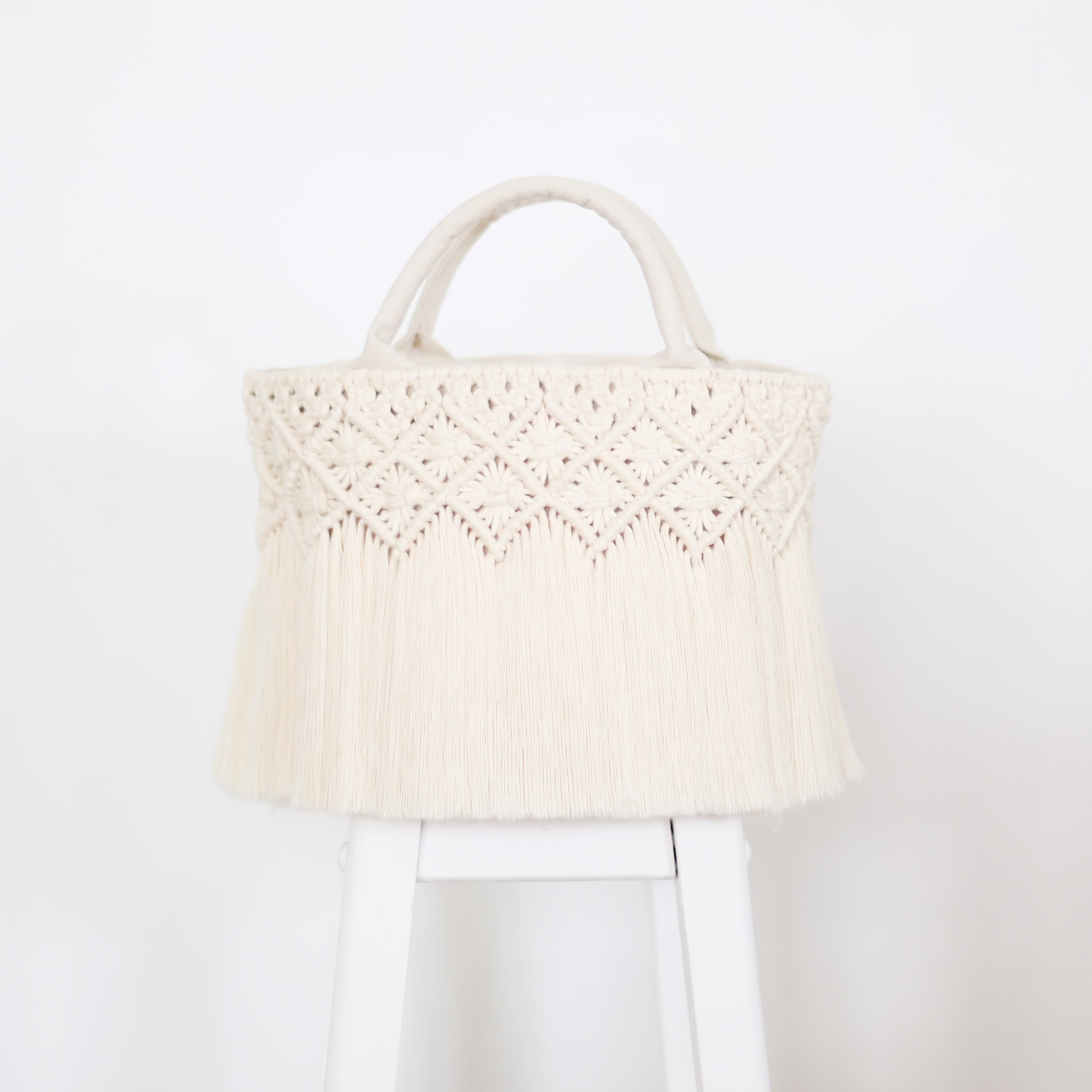 両面にマクラメ編みを施した贅沢なデザイン。